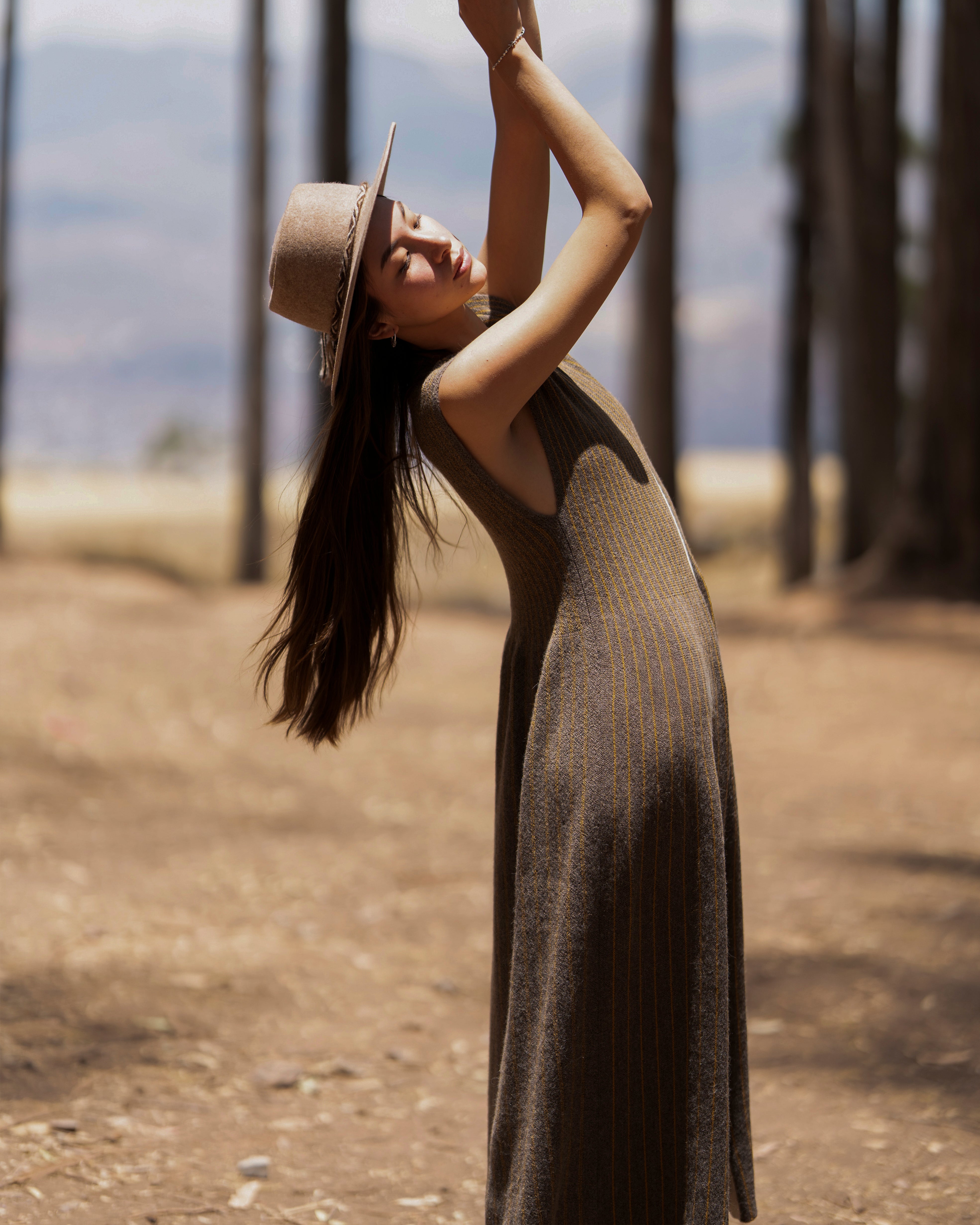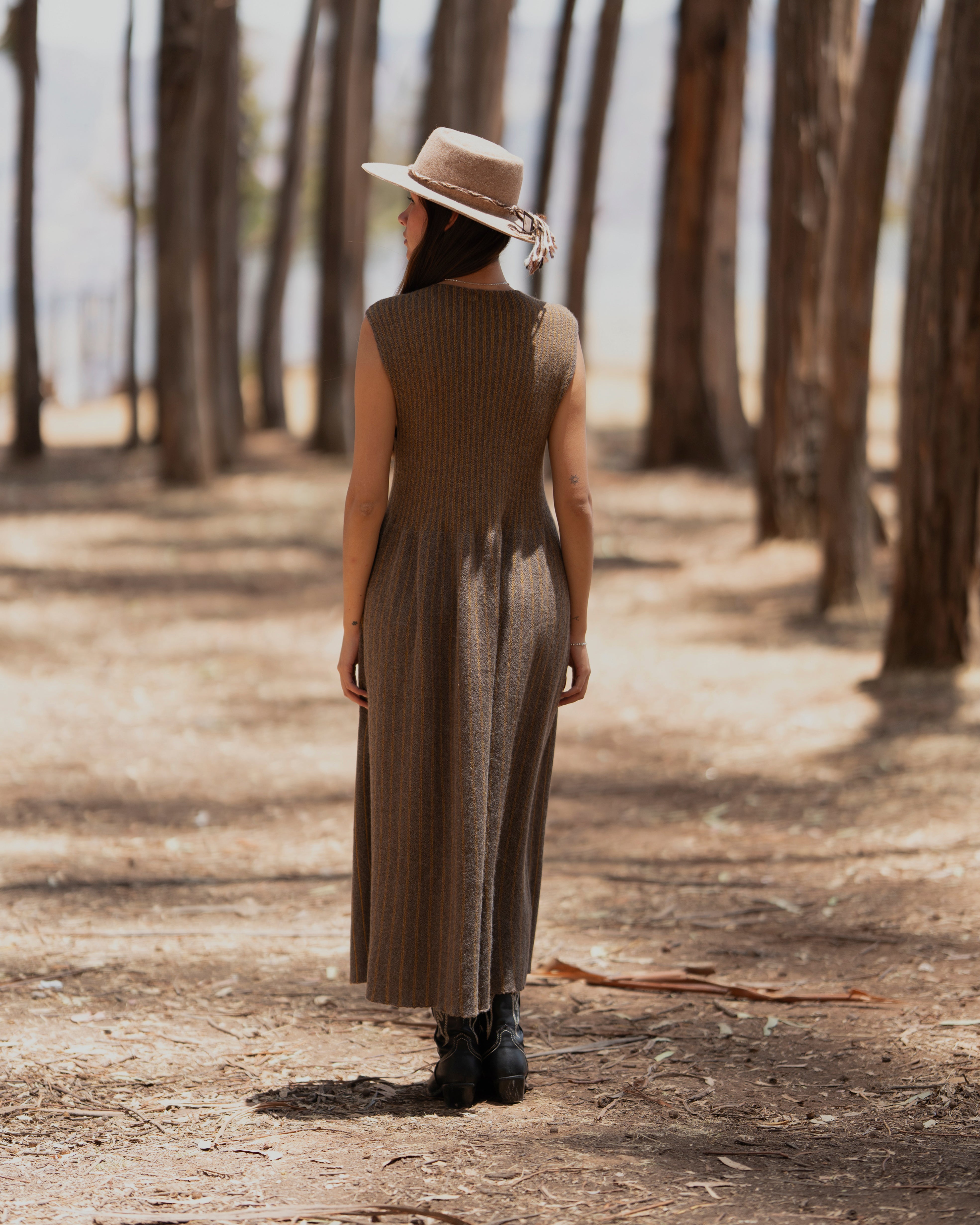 Casual sleeveless dress in natural fibers, featuring a three-color striped design. Lightweight, fresh and versatile, ideal for temperate climates. Handmade in Cusco, Peru.