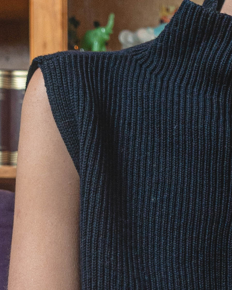 High neck vest for women with elegant side detail. Crafted in natural alpaca fiber, soft and warm. Contemporary sleeveless design with refined side finish that adds sophistication. Ideal for temperate or cold climates. Handmade in Peru.