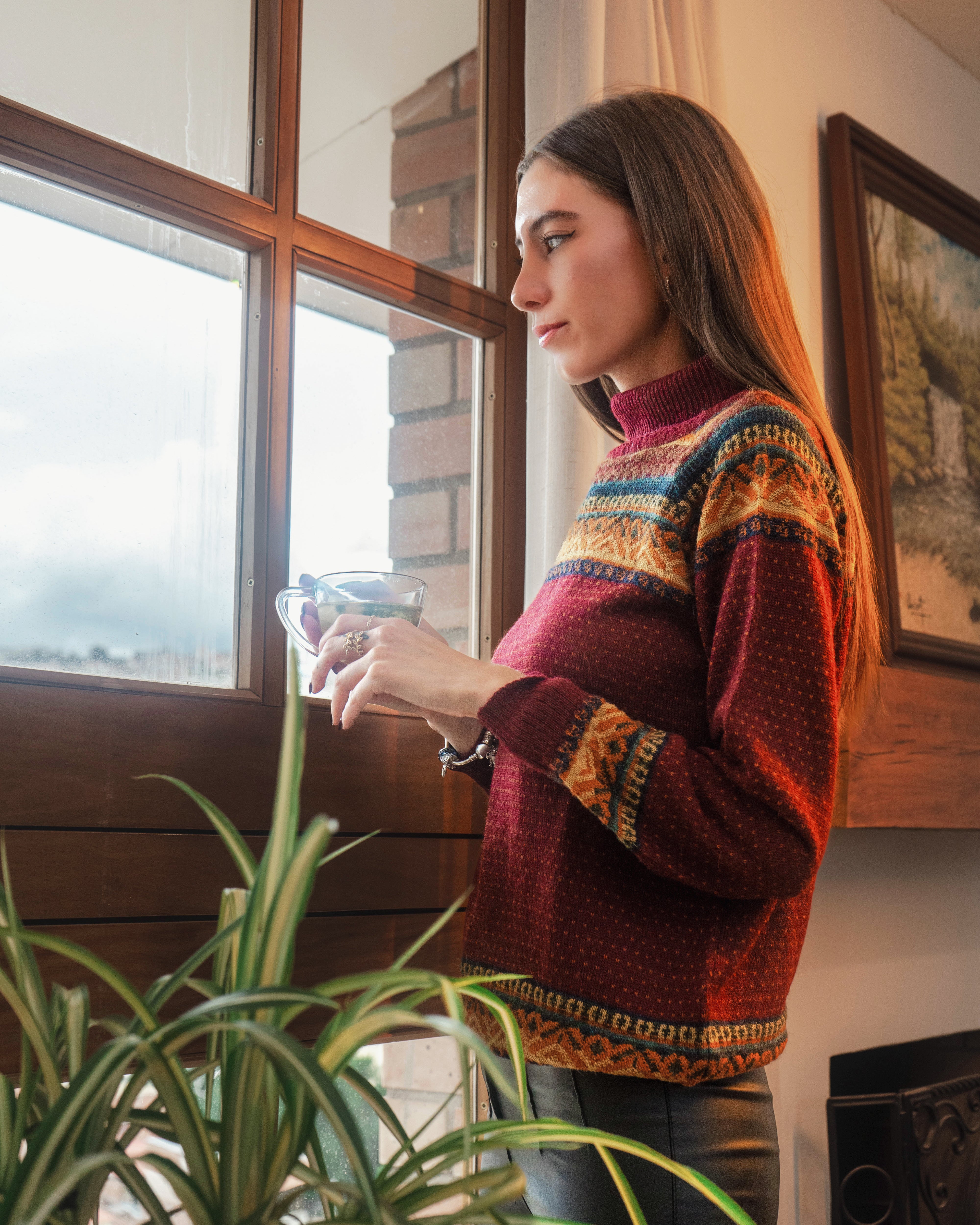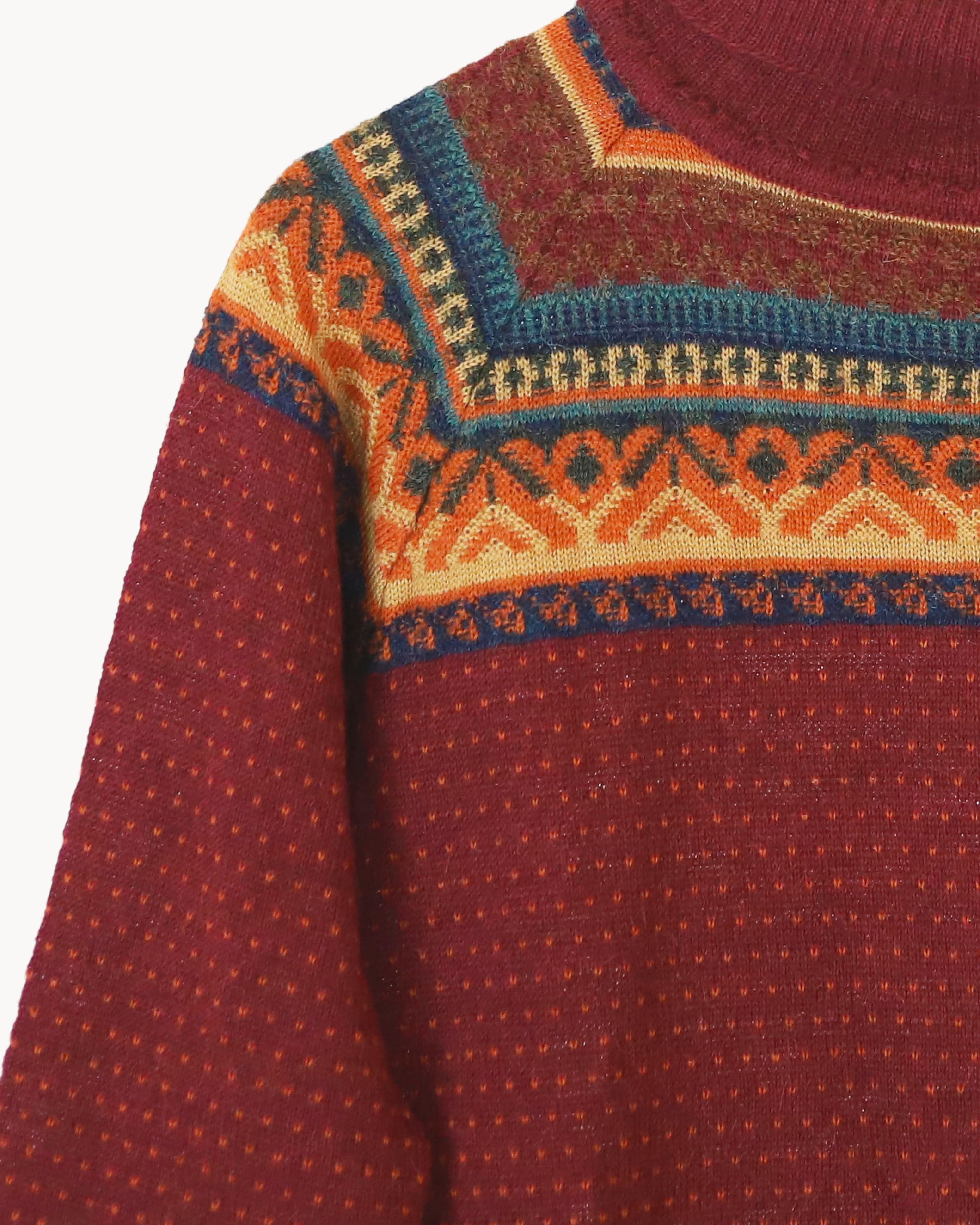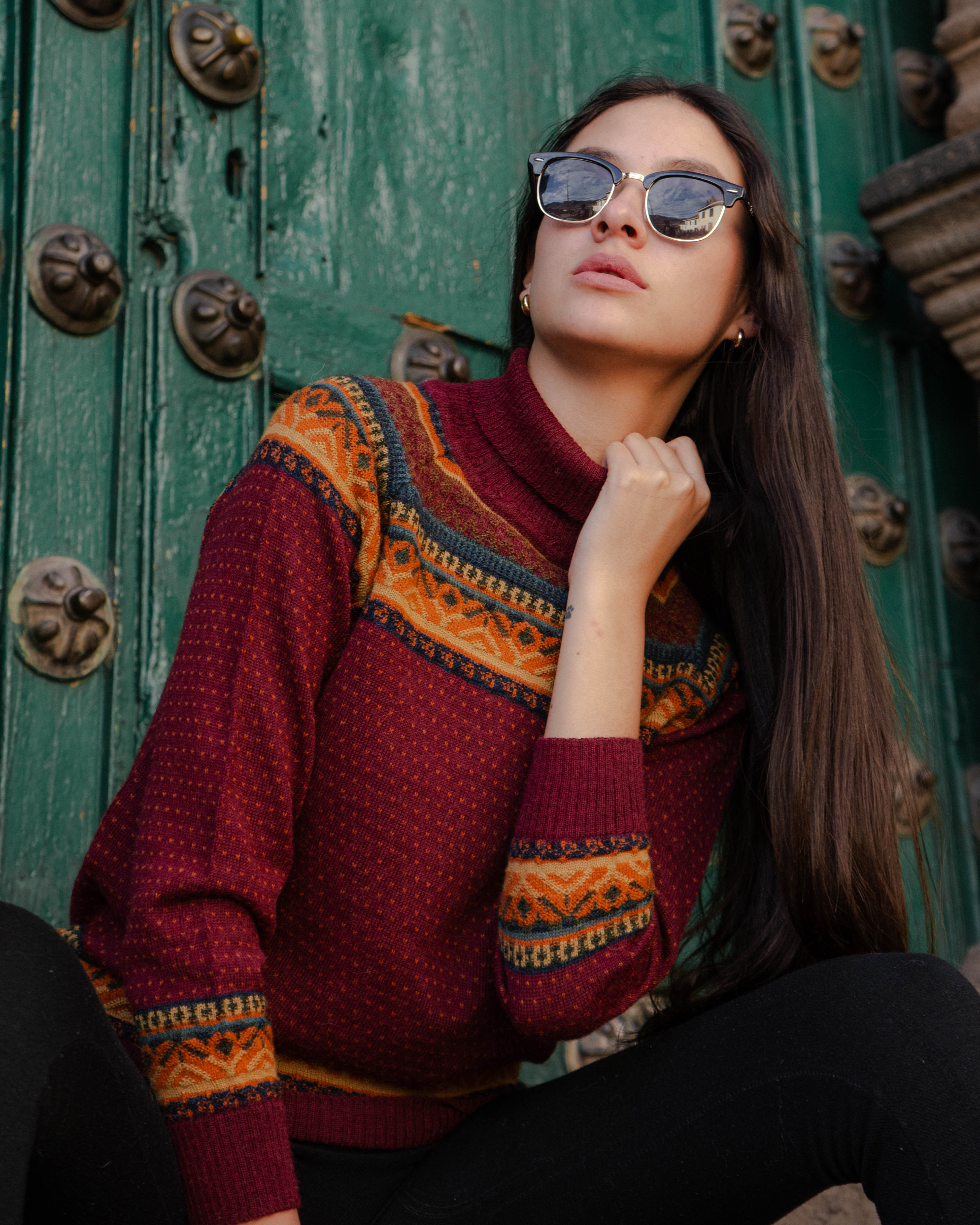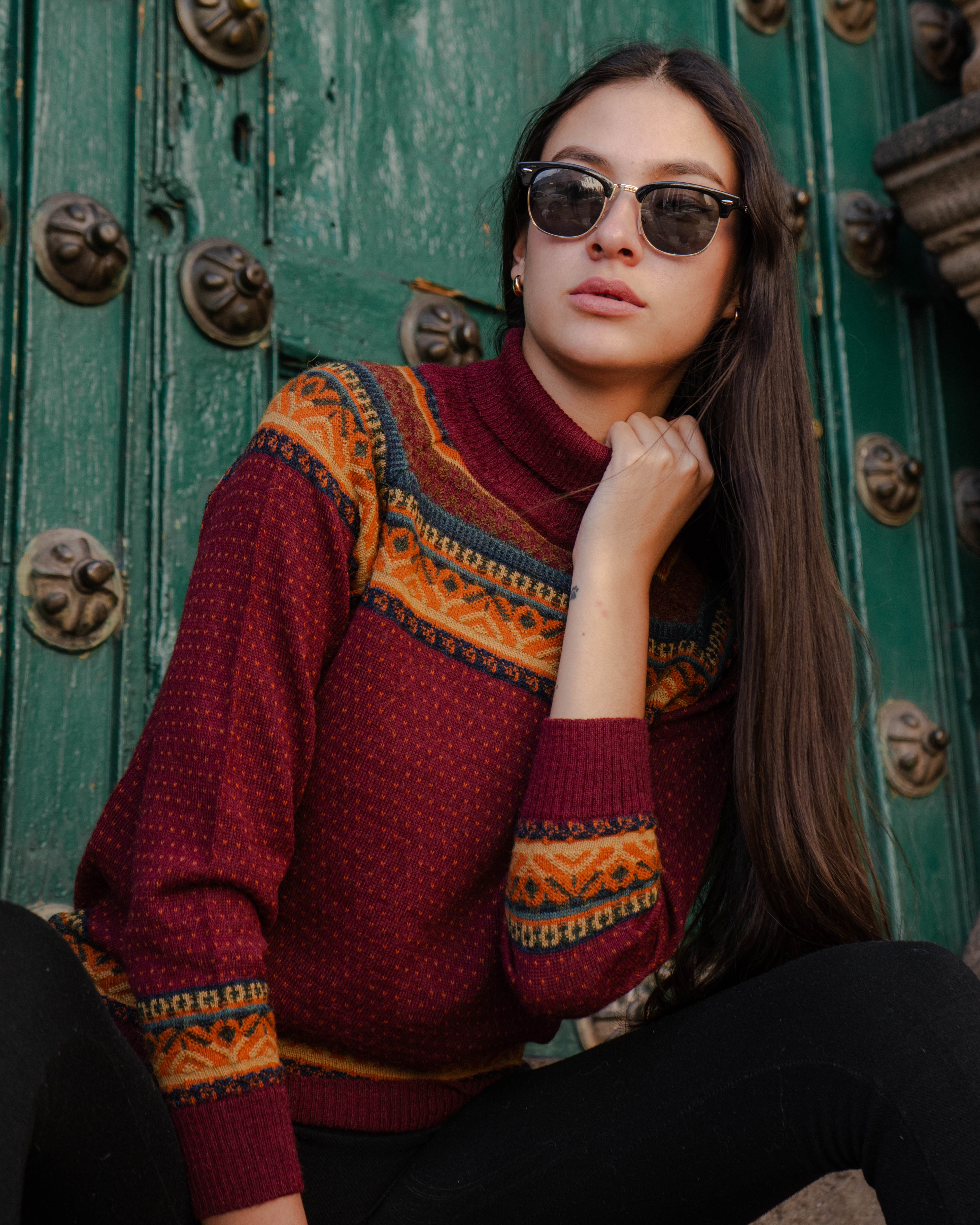 High neck sweater with jacquard design in multicolor Andean motifs. Crafted in natural baby alpaca fiber, ultra soft and warm. Artisanal technique with traditional geometric patterns in vibrant tones. Ideal for temperate or cold climates. Handmade in Peru.