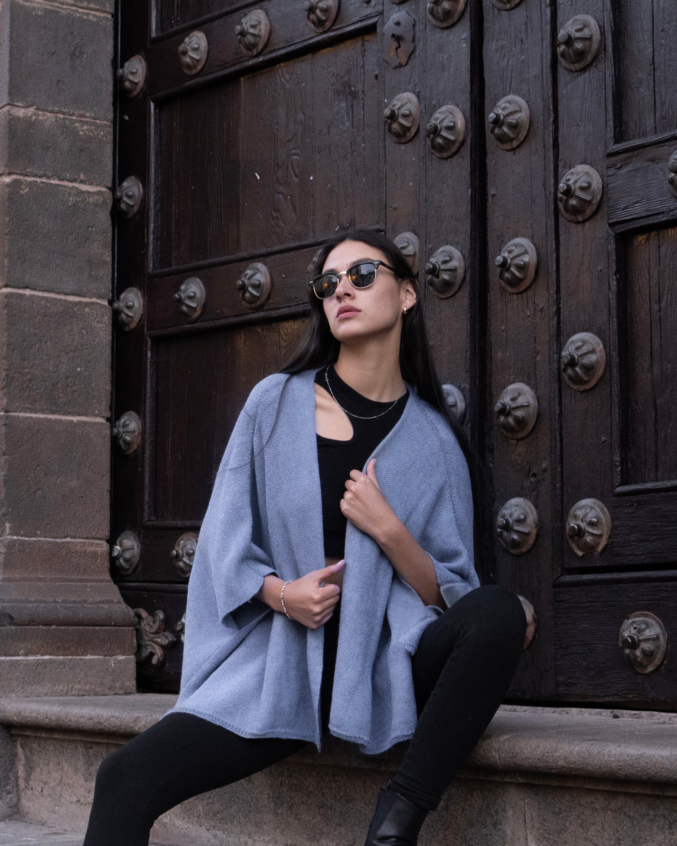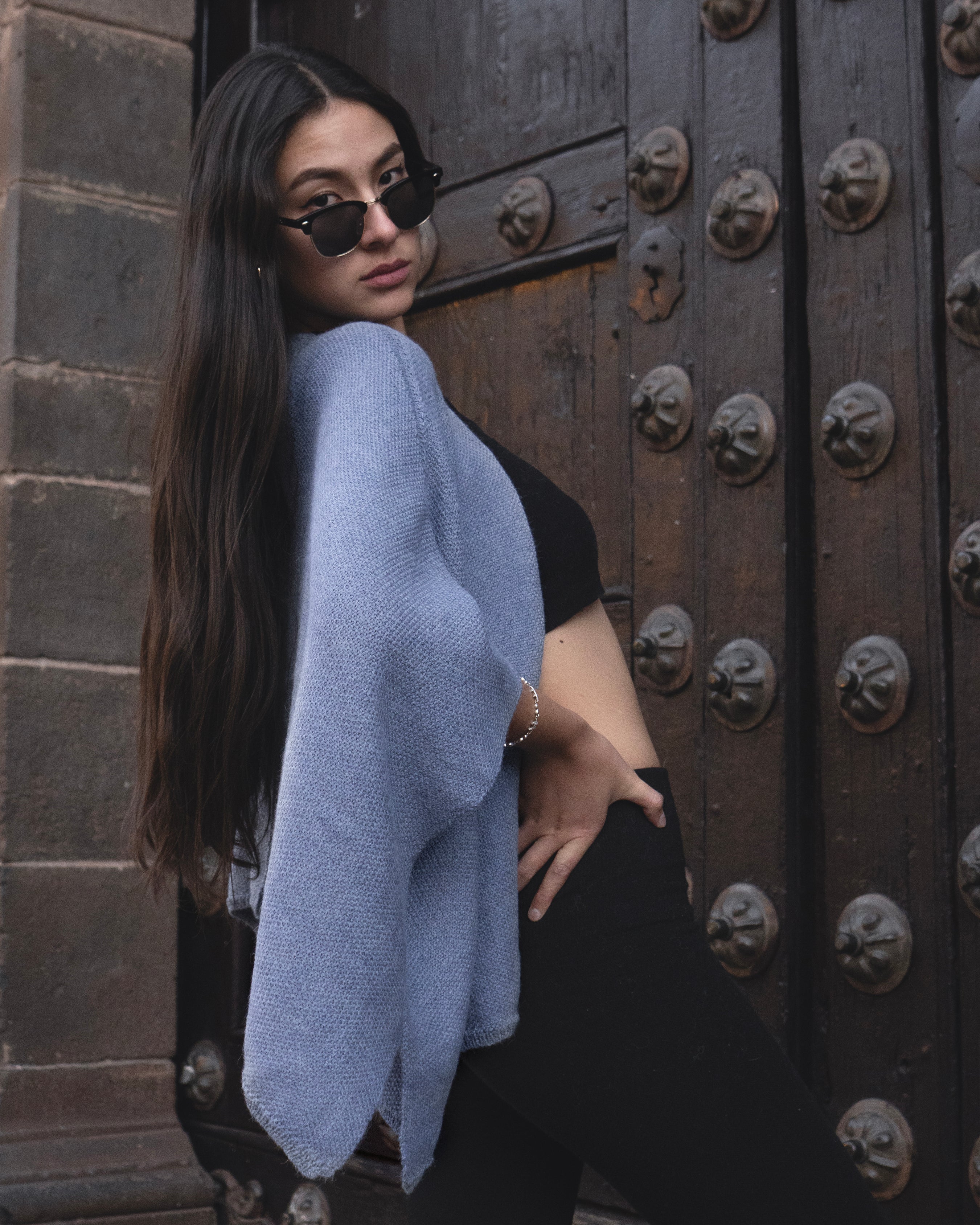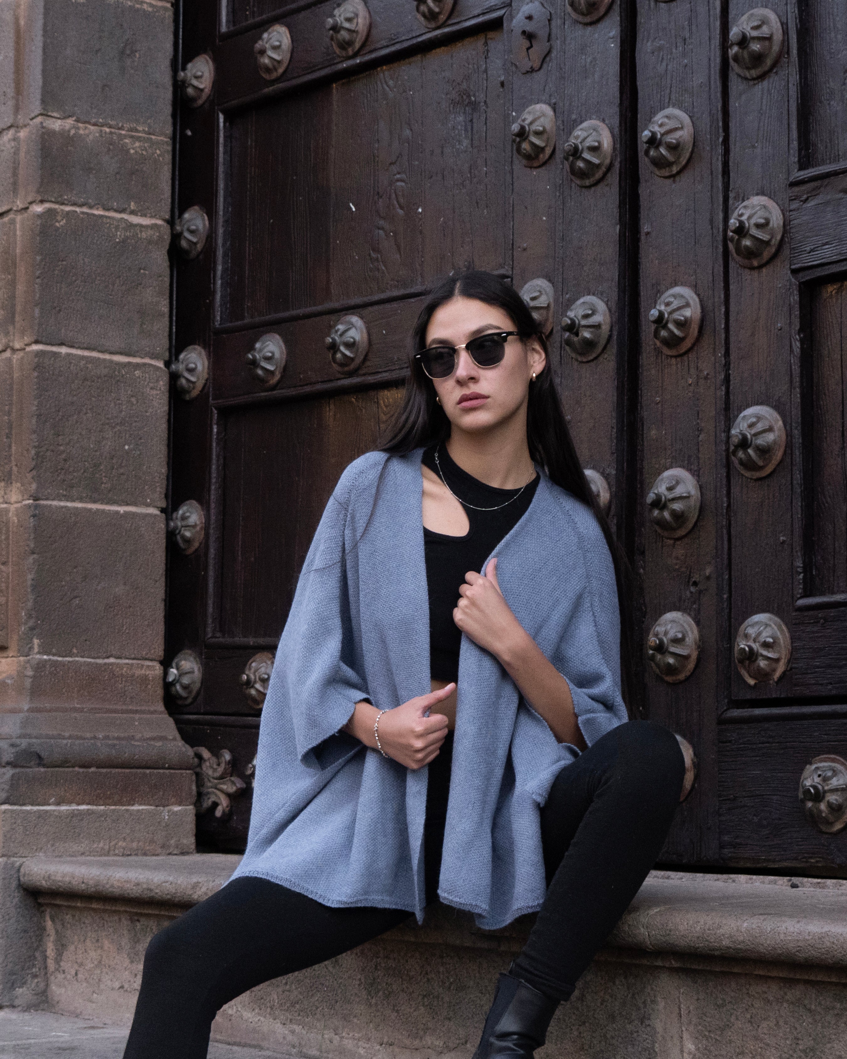 Elegant cape crafted from premium natural baby alpaca fiber. Versatile and sophisticated design with a fluid drape that adds a touch of distinction to any outfit. Its soft, silky texture provides exceptional comfort, while the natural properties of alpaca fiber offer ideal thermal regulation for any season. Perfect for creating both casual and formal looks.